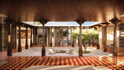 House of Nostalgia - is a blend of old and new. A home based on memories and south indian roots and heritage. An amalgamation of the snippets of the memories of the ancestoral home, with an infusion of modern take on experiencing a space , light and keeping things open, blending the inside and outside. The house is designed in a square format with the central focus as the courtyard around which the rest of the spaces are designed. The other spaces like the dining room, living room, kitchen, bar, powder room and bedrooms are placed as induviual spaces around the courtyard. Each space is kept separate so the space looks open and breathable, one is able to see the green gardens between these spaces. The bar and kitchen are open. The dining and living room are enclosed with wooden jali pivoted doors to make them semi open spaces. The concept was to keep the space open and connect the inside with the outside. The pool surrounds the bar and living room area. The reflections of the pool and the shadows created by the jali create a layer of uniqueness. The jali brick wall is used for the facade of the house where a small porch has been created. The antique door inside the house is adorned on either side with large stone sculptures. A wall seperates the two bedrooms from the rest of the common area to create a private space. This wall is used as a wall of memorabilia - where elements and antiques are kept for display. The small passage between the two room creates a unique library for a quite read in the open.